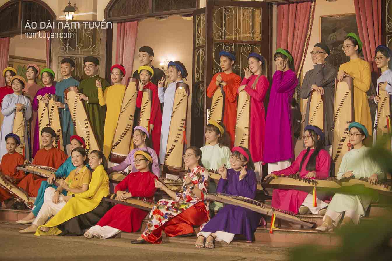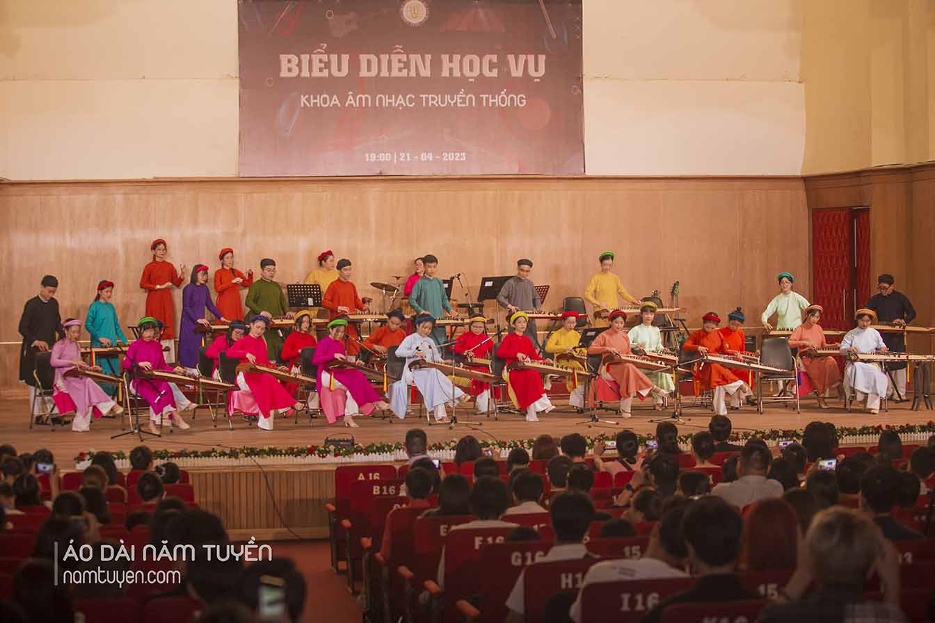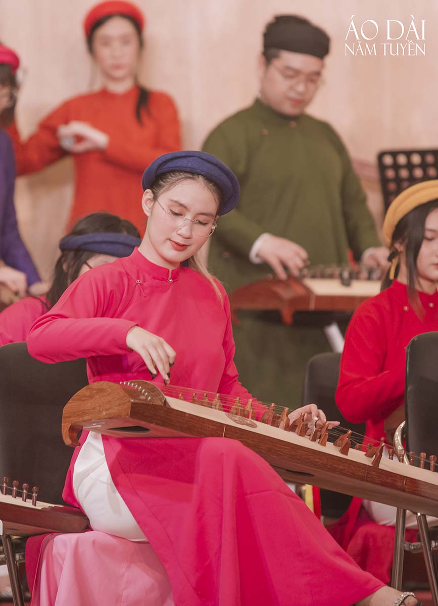 Hình ảnh những nghệ sĩ khoác lên mình áo dài ngũ thân truyền thống từ thương hiệu Năm Tuyền càng tôn lên vẻ đẹp chuẩn mực của người Việt – mộc mạc mà tinh tế, trang nghiêm mà đầy tự hào. Từ đàn tranh, đàn bầu, sáo trúc cho đến trống chiến – những thanh âm cổ xưa hòa cùng nét phục trang dân tộc tạo nên bản hòa ca của di sản văn hóa Việt đầy cảm xúc.