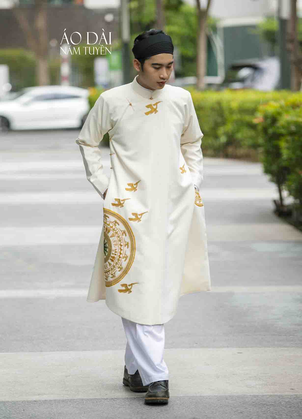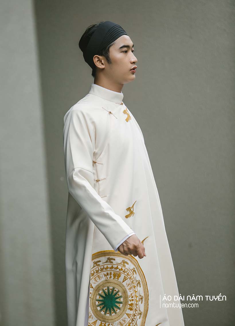 Áo dài nam ngũ thân truyền thống màu kem thêu hoa văn trống đồng