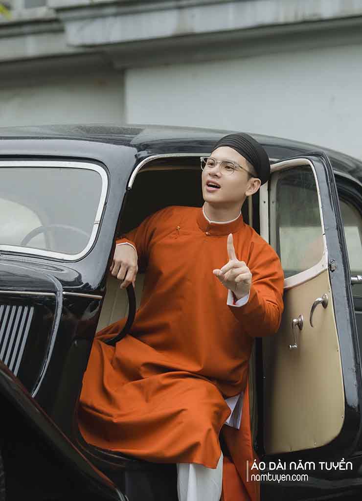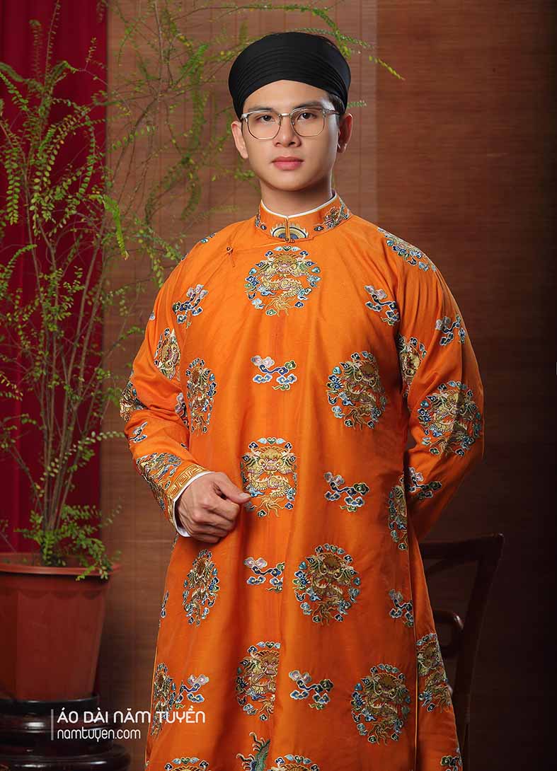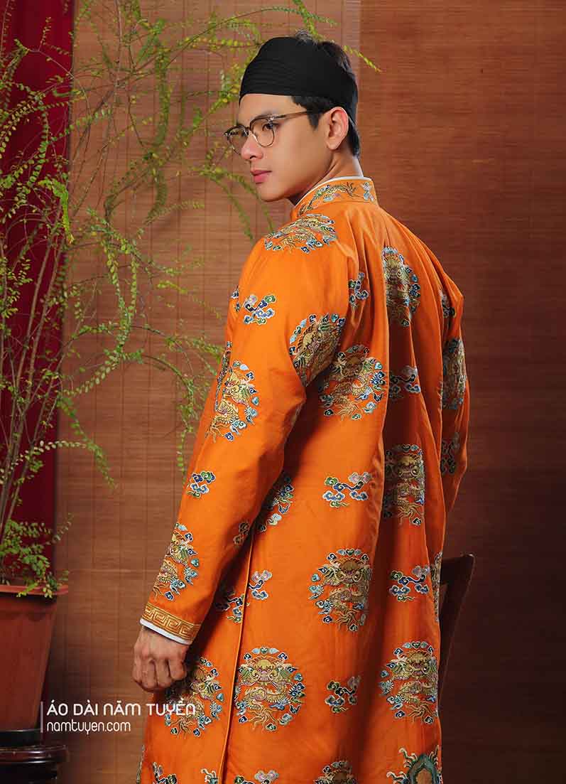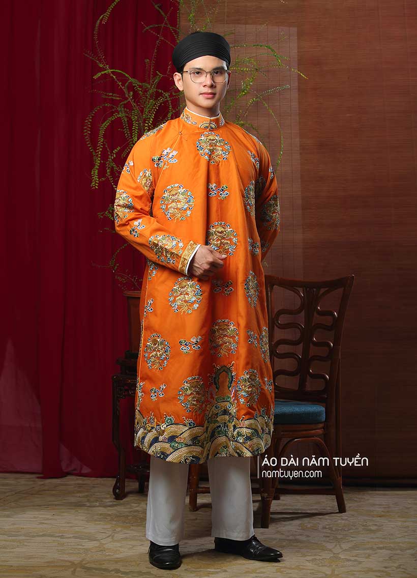 Áo dài nam truyền thống màu cam thêu hoa văn ổ rồng