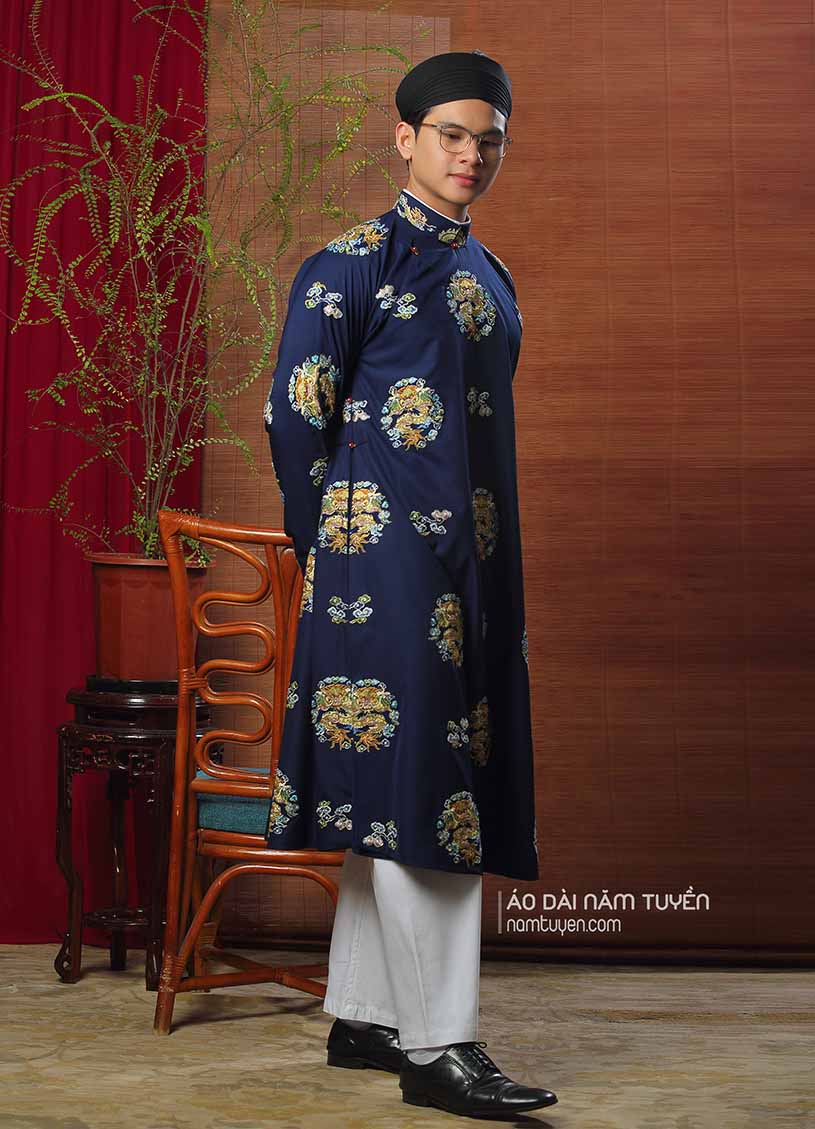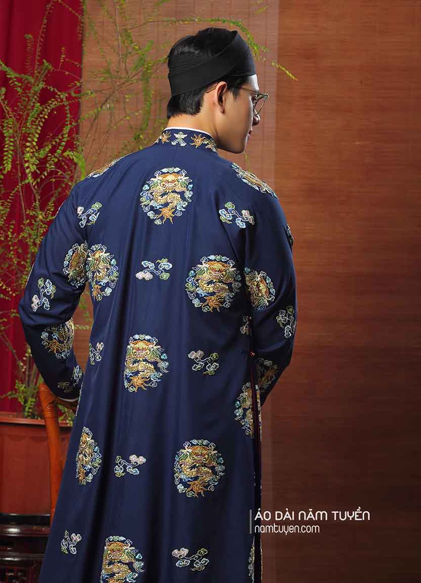 Áo Dài Nam truyền thống ngũ thân Thêu Ổ Rồng Xanh Đen