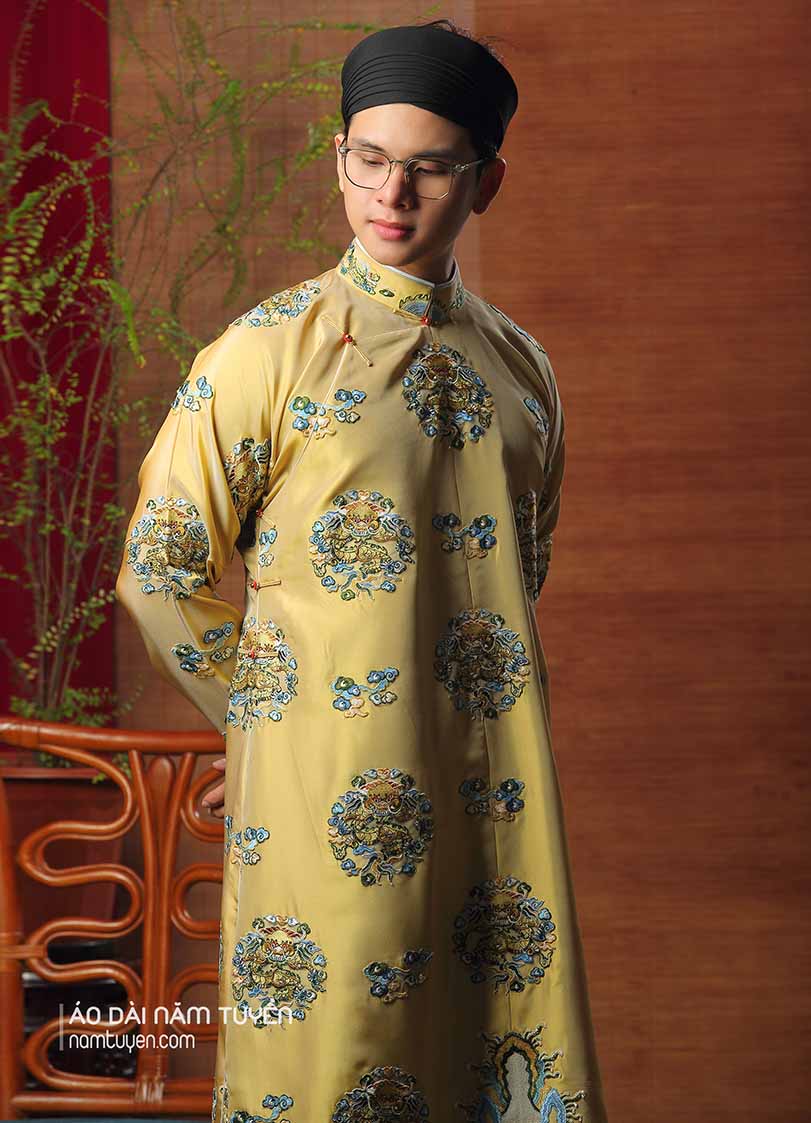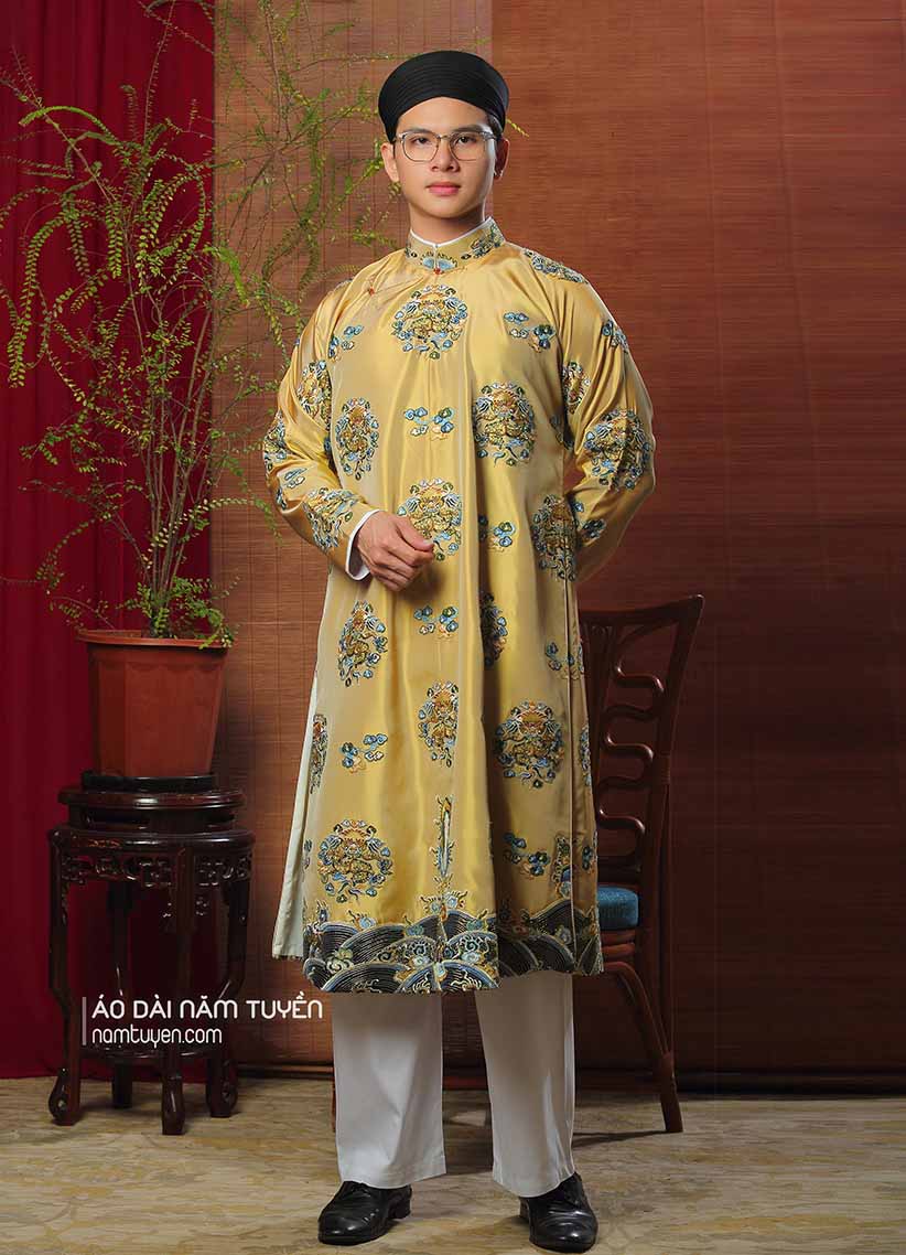 Áo dài nam truyền thống ngũ thân thêu ổ rồng nền vải vàng đồng