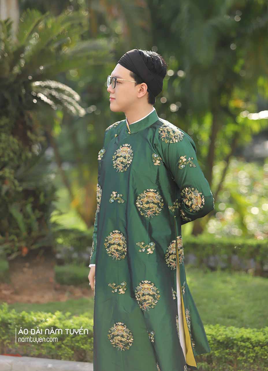 Áo dài ngũ thân nam truyền thống thêu ổ rồng tông màu xanh bích