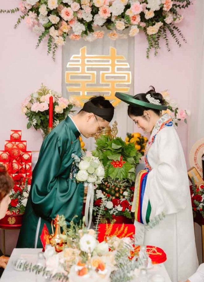 Trang phục cặp mang sự hòa hợp về màu – chất liệu – phong cách. Tạo nên hình ảnh chỉ cần nhìn thôi đã thấy đồng điệu – hạnh phúc – trang trọng.
